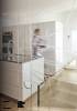 Чтобы допустить в самые отдаленные углы квартиры дневной свет, между спальней и кухней, а также в ванном отсеке по бокам и между помещениями были поставлены перегородки из стекла. Потолки и стены выкрасили в ослепительно белый цвет, что добавило освещенности квартире. Мебель, выстроенную из фанеры по чертежам архитекторов, тоже сделали белой. И только старый паркетный деревянный пол покрыли темно-синей особой смолой. В районе спальни стену украсила пара бра индустриального дизайна от Charlotte Perriand, а потолок – фантастический светильник, который занял почти всю длину над жилой частью помещения, разработанный специально для этого проекта голландским архитектором Mathijs Cremers. Интерьер квартиры вышел светлым, удобным, практичным, лаконичным и весьма показательным в плане экономии пространства.